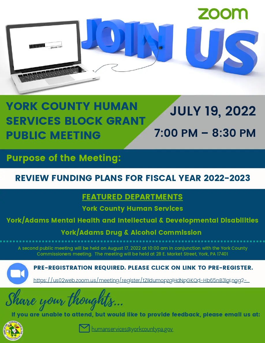York County Human Services Block Grant Meeting - 7/19/22 @ 7pm